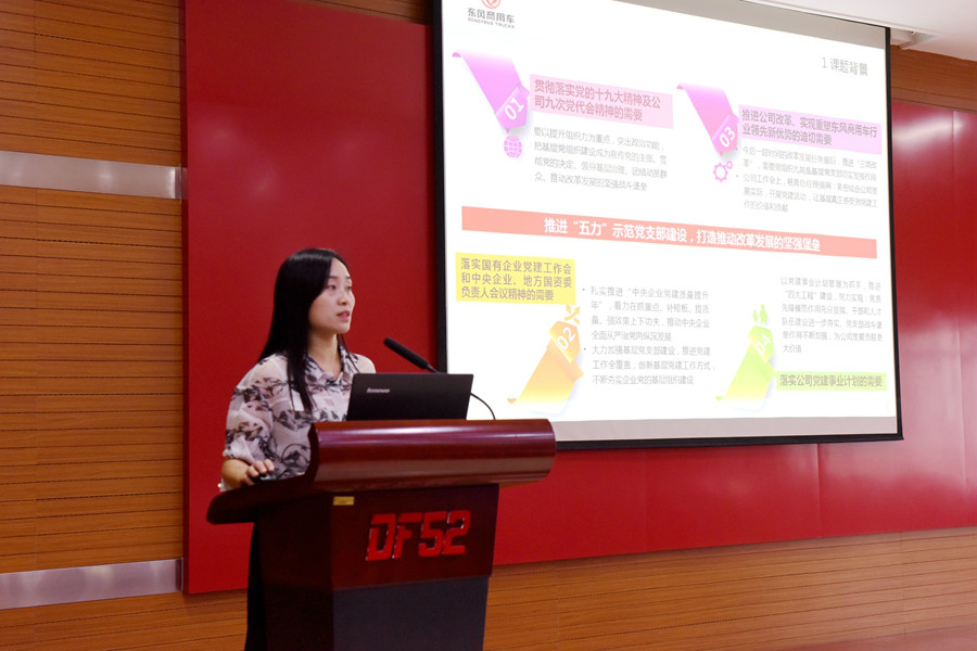 會(hui)上,組織(zhi)宣傳科(ke)科(ke)長李雪燕代表課(ke)題組匯報了(le)《“五(wu)力(li)(li)”示范(fan)(fan)黨(dang)(dang)支部建(jian)設》的(de)(de)選(xuan)題背(bei)景、課(ke)題目標、推進(jin)(jin)組織(zhi)機構、推進(jin)(jin)原則、課(ke)題方(fang)向(xiang)、關鍵行動、行動計劃分(fen)解及課(ke)題推進(jin)(jin)情況(kuang)和取(qu)得的(de)(de)成果(guo)。據了(le)解,該課(ke)題是東(dong)風(feng)商用車公(gong)(gong)司(si)(si)基于貫徹落實(shi)黨(dang)(dang)的(de)(de)十九(jiu)大精(jing)神及東(dong)風(feng)公(gong)(gong)司(si)(si)九(jiu)次黨(dang)(dang)代會(hui)精(jing)神的(de)(de)需要(yao)、落實(shi)國(guo)有企業黨(dang)(dang)建(jian)工作(zuo)會(hui)和中央企業、地方(fang)國(guo)資委負責人會(hui)議精(jing)神的(de)(de)需要(yao)、推進(jin)(jin)公(gong)(gong)司(si)(si)改革(ge)、實(shi)現(xian)重塑東(dong)風(feng)商用車行業領先(xian)新優勢的(de)(de)迫切需要(yao)、落實(shi)公(gong)(gong)司(si)(si)黨(dang)(dang)建(jian)事業計劃的(de)(de)需要(yao)而選(xuan)立的(de)(de),也是東(dong)風(feng)商用車公(gong)(gong)司(si)(si)努力(li)(li)打造黨(dang)(dang)建(jian)工作(zuo)特(te)色(se)品牌,致力(li)(li)提升(sheng)黨(dang)(dang)建(jian)工作(zuo)質量和經營融(rong)合度、貢獻度的(de)(de)有效舉措。據悉,“五(wu)力(li)(li)”就(jiu)是突出政治引領力(li)(li)、組織(zhi)保障力(li)(li)、推動發(fa)展力(li)(li)、宣傳發(fa)動力(li)(li)、凝聚(ju)服務力(li)(li)。東(dong)風(feng)商用車公(gong)(gong)司(si)(si)推進(jin)(jin)《“五(wu)力(li)(li)”示范(fan)(fan)黨(dang)(dang)支部建(jian)設》以來(lai),已(yi)取(qu)得了(le)階段(duan)性成果(guo):明(ming)確了(le)“五(wu)力(li)(li)” 黨(dang)支(zhi)(zhi)部(bu)(bu)創建(jian)辦法,出(chu)臺了(le)(le)“五(wu)力”黨(dang)支(zhi)(zhi)部(bu)(bu)評(ping)價(jia)(jia)細則;編印了(le)(le)《“五(wu)力”黨(dang)支(zhi)(zhi)部(bu)(bu)創建(jian)指(zhi)南》,完成了(le)(le)示范支(zhi)(zhi)部(bu)(bu)申(shen)報(bao);啟動開展爭做“四(si)優”黨(dang)員(yuan)活(huo)動,制(zhi)定發布了(le)(le)《黨(dang)員(yuan)“積分(fen)制(zhi)”指(zhi)導(dao)評(ping)價(jia)(jia)細則;明確了(le)(le)下(xia)一步行動方(fang)向(xiang)。